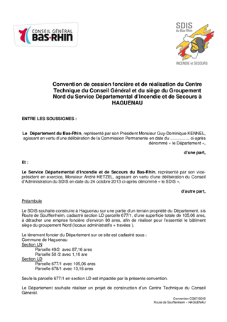 Le présent rapport a pour objet de soumettre à votre approbation la convention de cession foncière et les modalités de la vente d'une parcelle, issue du domaine privé du Département, au profit du Service Départemental d'Incendie et de Secours -SDIS- du Bas-Rhin à HAGUENAU pour la réalisation du bâtiment du siège du Groupement Nord.