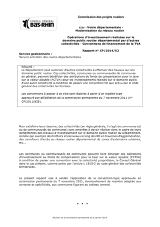 Le Département peut autoriser d’autres collectivités à effectuer des travaux sur son domaine public routier. Ces collectivités, communes ou communautés de communes en général, peuvent bénéficier des attributions du fonds de compensation pour la taxe sur la valeur ajoutée (FCTVA) pour les investissements réalisés sur le domaine public d’une autre collectivité à condition de passer une convention tel que prévu par le code général des collectivités territoriales. Les conventions à passer à ce titre sont établies à partir d’un modèle-type approuvé par délibération de la commission permanente du 7 novembre 2011 (n° CP/2011/825).