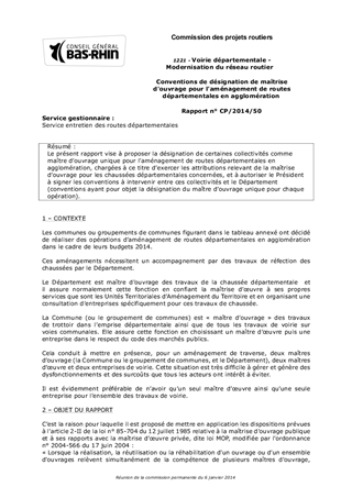 Le présent rapport vise à proposer la désignation de certaines collectivités comme maître d’ouvrage unique pour l’aménagement de routes départementales en agglomération, chargées à ce titre d’exercer les attributions relevant de la maîtrise d’ouvrage pour les chaussées départementales concernées, et à autoriser le Président à signer les conventions à intervenir entre ces collectivités et le Département (conventions ayant pour objet la désignation du maître d’ouvrage unique pour chaque opération).
