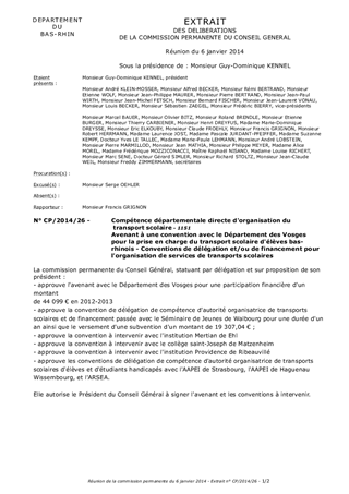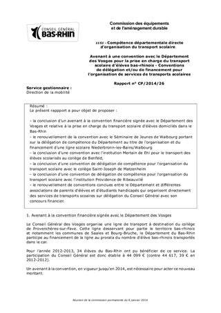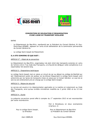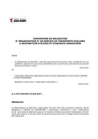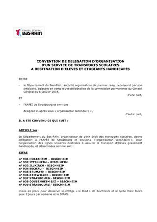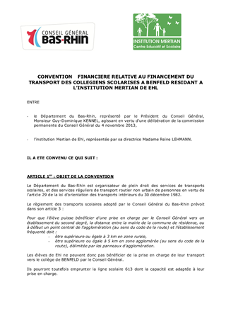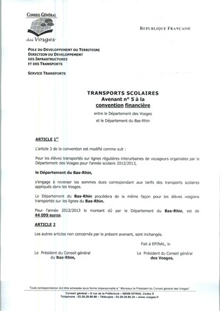 Le présent rappport a pour objet de proposer : - la conclusion d'un avenant à la convention financière signée avec le Département des Vosges et relative à la prise en charge du transport scolaire d'élèves domiciliés dans le Bas-Rhin - le renouvellement de la convention avec le Séminaire de Jeunes de Walbourg portant sur la délégation de compétence du Département au titre de l'organisation et du financement d'une ligne scolaire Niederbronn-les-Bains/Walbourg - la conclusion d'une convention avec l'institution Mertain de Ehl pour le transport des élèves scolarisés au collège de Benfeld, - la conclusion d'une convention de délégation de compétence pour l'organisation du transport scolaire avec le collège Saint-Joseph de Matzenheim - la conclusion d'une convention de délégation de compétence pour l'organisation du transport scolaire avec l'institution Providence de Ribeauvillé - le renouvellement de conventions conclues entre le Département et différentes associations de parents d'élèves et d'étudiants handicapés qui organisent directement des services de transports scoalres sur délégation du Conseil Général avec son concours financier.