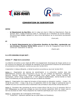 Comité départemental de la Prévention routière du Bas-Rhin - Subvention et convention annuelle 2013