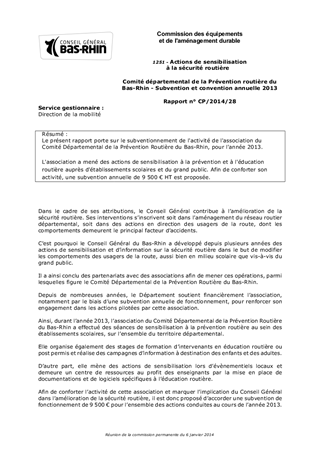 Le présent rapport porte sur le subventionnement de l'activité de l'association du Comité Départemental de la Prévention Routière du Bas-Rhin, pour l'année 2013. L'association a mené des actions de sensibilisation à la prévention et à l'éducation routière auprès d'établissements scolaires et du grand public. Afin de conforter son activité, une subvention annuelle de 9 500 € HT est proposée.