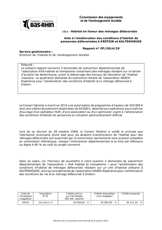 Le présent rapport concerne 3 demandes de subvention départementale de l'association AVA habitat et nomadisme concernant des ménages résidant sur le terrain d'aviation de Kaltenhouse, avant le démarrage des travaux de résorption de l'habitat insalubre. La quatrième demande de subvention émane de l'association ARSEA-Espérance pour l'amélioration des conditions d'habitat d'un ménage défavorisé à Erstein.