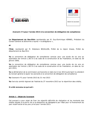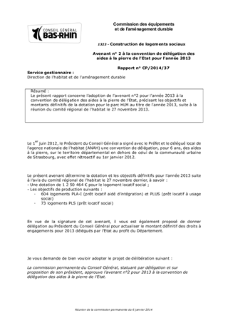 Le présent rapport concerne l'adoption de l'avenant n°2 pour l'année 2013 à la convention de délégation des aides à la pierre de l'Etat, précisant les objectifs et montants définitifs de la dotation pour le parc HLM au titre de l'année 2013, suite à la réunion du comité régional de l'habitat le 27 novembre 2013.