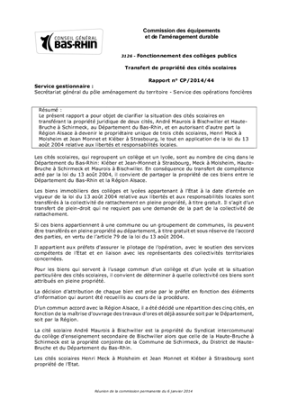 Le présent rapport a pour objet de clarifier la situation des cités scolaires en transférant la propriété juridique de deux cités, André Maurois à Bischwiller et Haute-Bruche à Schirmeck, au Département du Bas-Rhin, et en autorisant d'autre part la Région Alsace à devenir le propriétaire unique de trois cités scolaires, Henri Meck à Molsheim et Jean Monnet et Kléber à Strasbourg, le tout en application de la loi du 13 août 2004 relative aux libertés et responsabilités locales.