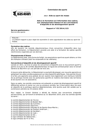 Le présent rapport a pour objet de soumettre à votre approbation les aides au sport de masse.