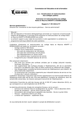 Afin de répondre à l’évolution démographique annoncée sur l’ouest de la Communauté Urbaine de Strasbourg, le principe d’une extension et restructuration du collège Katia et Maurice KRAFFT à ECKBOLSHEIM est arrêté. Le présent rapport a pour objet de soumettre à votre approbation la validation du programme technique détaillé de cette opération.