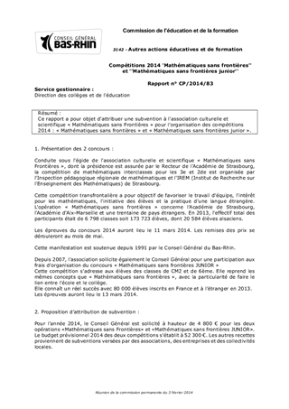 Ce rapport a pour objet d'attribuer une subvention à l'association culturelle et scientifique « Mathématiques sans Frontières » pour l'organisation des compétitions 2014 : « Mathématiques sans frontières » et « Mathématiques sans frontières junior ».