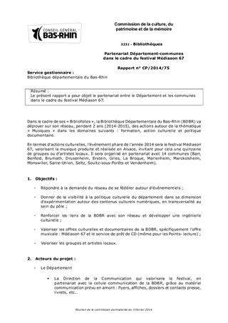Le présent rapport a pour objet le partenariat entre le Département et les communes dans le cadre du festival Médiason 67.