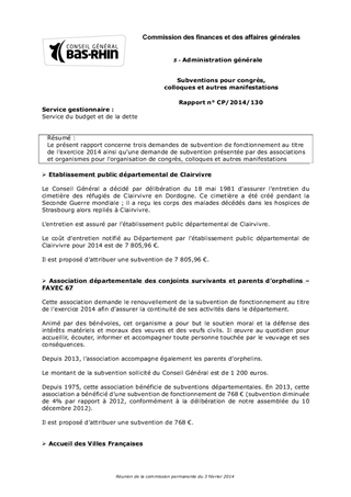 Le présent rapport concerne trois demandes de subvention de fonctionnement au titre de l’exercice 2014 ainsi qu’une demande de subvention présentée par des associations et organismes pour l’organisation de congrès, colloques et autres manifestations