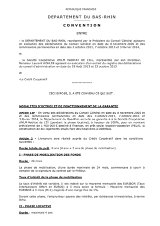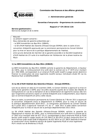 Le présent rapport concerne : Deux demandes de garantie présentées par : - la SEM Immobilière du Bas-Rhin (SIBAR), - la SA d’HLM Habitat des Salariés d’Alsace-Groupe DOMIAL dans le cadre d’une convention d’objectifs approuvée par la commission permanente du Conseil Général pour la mise en œuvre de la politique départementale de l’habitat, ainsi qu'une demande de maintien de la garantie accordée à la Société Coopérative d’HLM Habitat de L’Ill suite à la modification de l’échéancier de la phase locative du PSLA