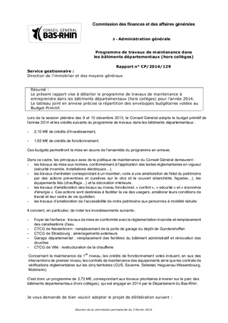 Le présent rapport vise à détailler le programme de travaux de maintenance à entreprendre dans les bâtiments départementaux (hors collèges) pour l’année 2014. Le tableau joint en annexe précise la répartition des enveloppes budgétaires votées au Budget Primitif.