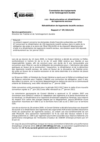 Le présent rapport concerne les demandes d’aide financière présentées par OPUS 67 concernant la réhabilitation de 156 logements locatifs sociaux dans le cadre de la délégation des aides à la pierre de l’Etat (PALULOS) et du dispositif départemental d’aide à la réhabilitation de logements locatifs sociaux, ces dossiers ayant été déposés antérieurement au 1er janvier 2013.
