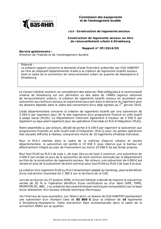 Le présent rapport concerne la demande d'aide financière présentée par CUS HABITAT au titre du dispositif départemental d'aide à la création de logements locatifs sociaux dans le cadre de la convention de renouvellement urbain du quartier de Hautepierre à Strasbourg.