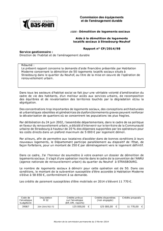 Le présent rapport concerne la demande d'aide financière présentée par Habitation Moderne concernant la démolition de 50 logements locatifs sociaux situés à Strasbourg dans le quartier du Neuhof, au titre de la mise en oeuvre de l'opération de renouvellement urbain.