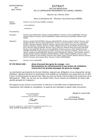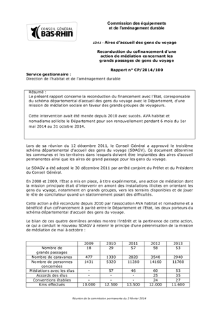 Le présent rapport concerne la reconduction du financement avec l'Etat, coresponsable du schéma départemental d'accueil des gens du voyage avec le Département, d'une mission de médiation sociale en faveur des grands groupes de voyageurs. Cette intervention avait été menée depuis 2010 avec succès. AVA habitat et nomadisme sollicite le Département pour son renouvellement pendant 6 mois du 1er mai 2014 au 31 octobre 2014.