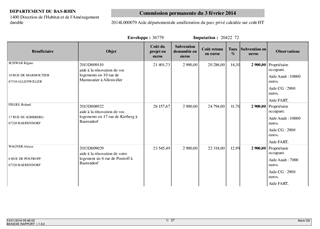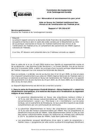 Le présent rapport concerne la demande d'aide financière de propriétaires privés occupants et bailleurs dans le cadre des aides versées par le Département au titre de sa politique volontariste en faveur de l'habitat traditionnel bas-rhinois et de l'amélioration de l'habitat privé, en complément des subventions de l'ANAH (agence nationale de l'habitat). A ce titre, 97 dossiers sont présentés dans les 2 tableaux annexés au rapport.