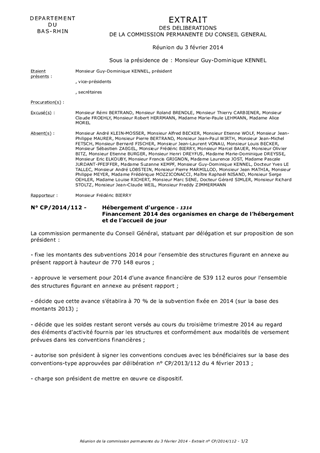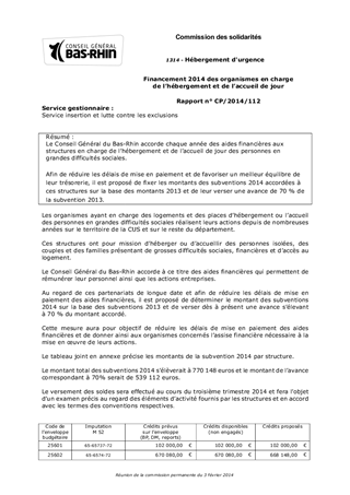 Le Conseil Général du Bas-Rhin accorde chaque année des aides financières aux structures en charge de l’hébergement et de l’accueil de jour des personnes en grandes difficultés sociales. Afin de réduire les délais de mise en paiement et de favoriser un meilleur équilibre de leur trésorerie, il est proposé de fixer les montants des subventions 2014 accordées à ces structures sur la base des montants 2013 et de leur verser une avance de 70 % de la subvention 2013.