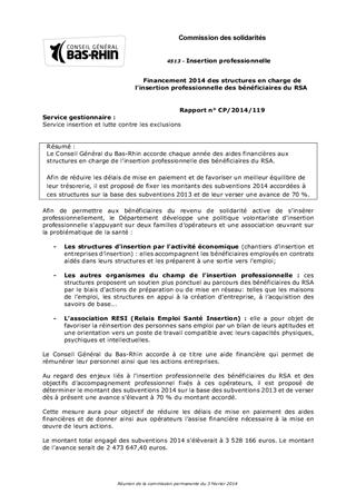 Le Conseil Général du Bas-Rhin accorde chaque année des aides financières aux structures en charge de l'insertion professionnelle des bénéficiaires du RSA. Afin de réduire les délais de mise en paiement et de favoriser un meilleur équilibre de leur trésorerie, il est proposé de fixer les montants des subventions 2014 accordées à ces structures sur la base des subventions 2013 et de leur verser une avance de 70 %.