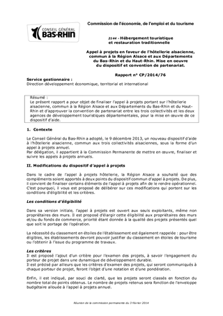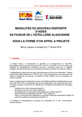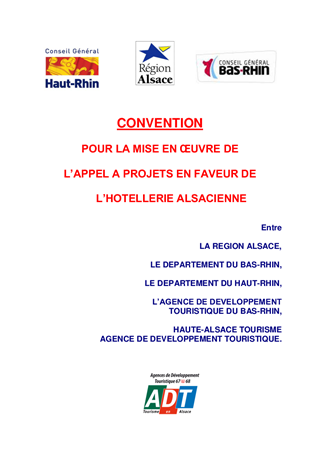 Le présent rapport a pour objet de finaliser l’appel à projets portant sur l’hôtellerie alsacienne, commun à la Région Alsace et aux Départements du Bas-Rhin et du Haut-Rhin et d’approuver la convention de partenariat entre les trois collectivités et les deux agences de développement touristiques départementales, pour la mise en œuvre de ce dispositif d’aide.