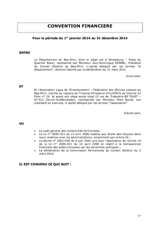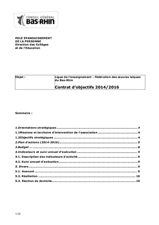 Ligue de l'enseignement du Bas-Rhin- Contrat d'objectifs 2014-2016 et convention financière 2014