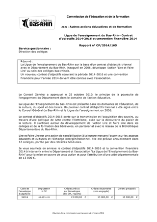 La Ligue de l'enseignement du Bas-Rhin sur la base d'un contrat d'objectifs triennal avec le Département du Bas-Rhin, inauguré en 2006, développe l’action 'Lire et Faire Lire' au sein des collèges bas-rhinois. Un nouveau contrat d’objectifs couvrant la période 2014-2016 et une convention financière pour l'année 2014 doivent être conclus avec l'association.