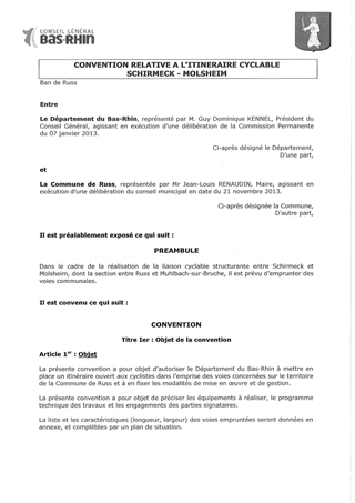 En partenariat avec des acteurs locaux, le Département réalise des itinéraires cyclables dans le cadre des dispositions du Plan Vélo 2020 et des contrats de territoires. Ces partenariats sont formalisés par des conventions passées avec des collectivités publiques ou des acteurs de droit privé. Le présent rapport a pour objet d'approuver les termes des conventions à passer avec la commune et l'association foncière de Russ d'une part, avec la commune de Muhlbach-sur-Bruche d'autre part et à autoriser le Président à les signer.