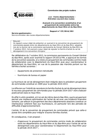 Ce rapport a pour objet de présenter un avenant à la convention de groupement de commandes passée entre les départements du Haut-Rhin et du Bas-Rhin, adoptée lors de la réunion de la commission permanente du Conseil Général du Bas-Rhin du 7 octobre 2013. Cet avenant a pour objet de rajouter la famille d'achat du sel de déneigement à la convention d'origine.