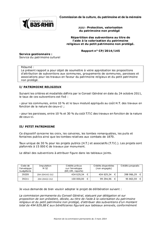 Le présent rapport a pour objet de soumettre à votre approbation les propositions d'attribution de subventions aux communes, groupements de communes, paroisses et associations pour les travaux en faveur du patrimoine religieux et du petit patrimoine non protégé.