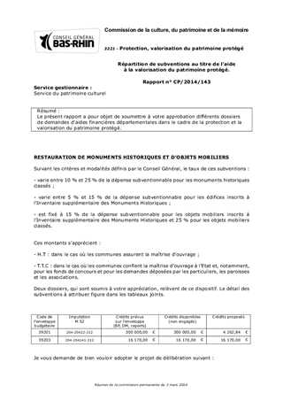 Répartition de subventions au titre de l'aide à la valorisation du patrimoine protégé.