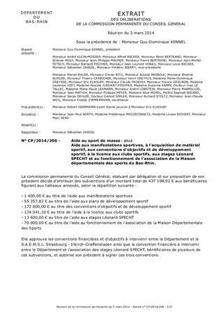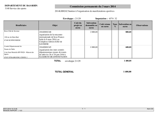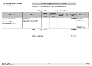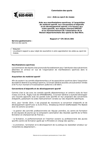 Aide aux manifestations sportives, à l’acquisition de matériel sportif, aux conventions d’objectifs et de développement sportif, à la licence aux clubs sportifs, aux stages Léonard SPECHT et au fonctionnement de l’association de la Maison départementale des sports du Bas-Rhin.