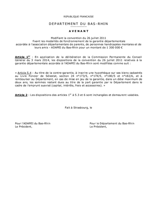 Garanties d’emprunts - Organismes divers Resumé Le présent rapport concerne une demande de mainlevée présentée par l’Adapei du Bas-Rhin Pièces jointes Délibération Rapport Avenant mainlevée Adapei Benfeld.pdf Assemblée : Commission Permanente Date : 03/03/2014 Rapporteur : Monsieur Bernard FISCHER Collectivité : Conseil départemental du Bas-Rhin Direction : Direction des finances et de la commande publique Service : Service du budget et de la dette Domaine : Non renseigné Commission : M - Commission des finances et des affaires générales