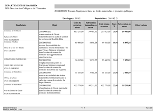 Le Conseil Général apporte son soutien aux travaux d'investissement réalisés dans les écoles maternelles et élémentaires publiques par les collectivités. Le crédit inscrit au budget primitif est réparti par la commission permanente du Conseil Général.