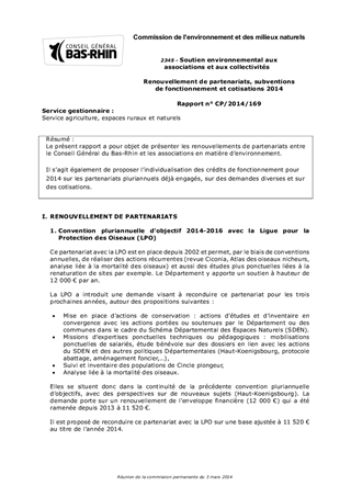 Le présent rapport a pour objet de présenter les renouvellements de partenariats entre le Conseil Général du Bas-Rhin et les associations en matière d’environnement. Il s’agit également de proposer l’individualisation des crédits de fonctionnement pour 2014 sur les partenariats pluriannuels déjà engagés, sur des demandes diverses et sur des cotisations.