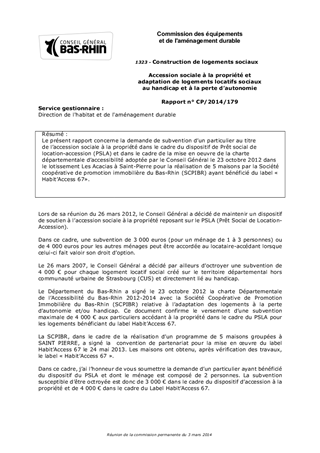 Le présent rapport concerne la demande de subvention d’un particulier au titre de l’accession sociale à la propriété dans le cadre du dispositif de Prêt social de location-accession (PSLA) et dans le cadre de la mise en oeuvre de la charte départementale d’accessibilité adoptée par le Conseil Général le 23 octobre 2012 dans le lotissement Les Acacias à Saint-Pierre pour la réalisation de 5 maisons par la Société coopérative de promotion immobilière du Bas-Rhin (SCPIBR) ayant bénéficié du label « Habit’Access 67».