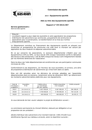 Le présent rapport a pour objet de soumettre à votre approbation les propositions d’attribution de subventions aux communes, groupements de communes et associations pour la construction, la transformation et la mise aux normes d’équipements sportifs.