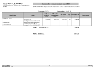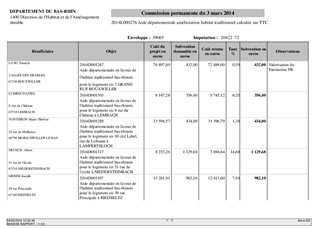 Le présent rapport concerne la demande d'aide financière de propriétaires privés occupants et de bailleurs dans le cadre des aides versées par le Département au titre de sa politique volontariste en faveur de l'habitat traditionnel bas-rhinois et de l'amélioration de l'habitat privé, en complément des subventions de l'ANAH (agence nationale de l'habitat). A ce titre, 77 dossiers sont présentés dans les quatre tableaux annexés au rapport.