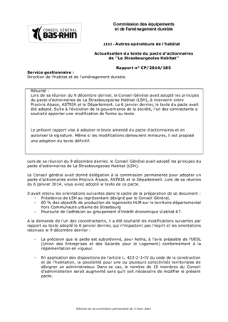 Lors de sa réunion du 9 décembre dernier, le Conseil Général avait adopté les principes du pacte d’actionnaires de La Strasbourgeoise Habitat (LSH), à intervenir entre Procivis Alsace, ASTRIA et le Département. Le 6 janvier dernier, le texte du pacte avait été adopté. Suite à l'évolution de la gouvernance de la société, l'un des contractants a souhaité apporter une modification de forme au texte. Le présent rapport vise à adopter le texte amendé du pacte d’actionnaires et en autoriser la signature. Même si les modifications demeurent mineures, il est proposé une adoption du texte définitif.