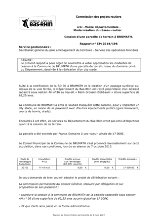 Le présent rapport a pour objet de soumettre à votre approbation les modalités de cession à la Commune de BRUMATH d'une parcelle de terrain, issue du domaine privé du Département, destinée à la réalisation d'un city stade.