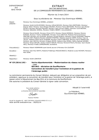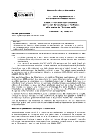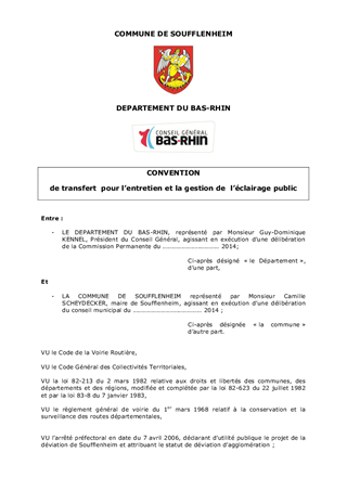 Le présent rapport concerne l'approbation de la convention de transfert du département du Bas-Rhin à la commune de Soufflenheim, de l'entretien et la gestion de l'éclairage public réalisé dans le cadre des travaux de réalisation de la déviation de la RD1063 à Soufflenheim.
