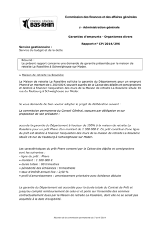 Le présent rapport concerne une demande de garantie présentée par la maison de retraite La Roselière à Schweighouse sur Moder.