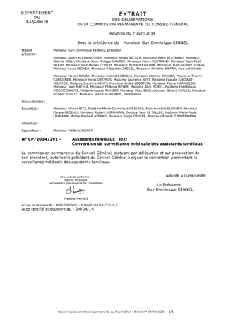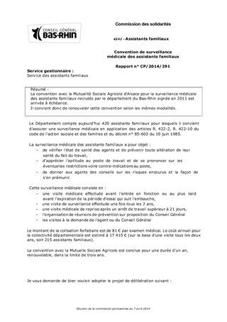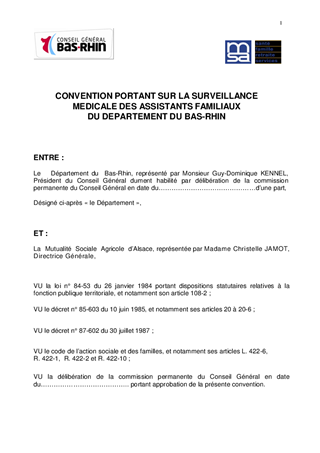 La convention avec la Mutualité Sociale Agricole d'Alsace pour la surveillance médicale des assistants familiaux recrutés par le département du Bas-Rhin signée en 2011 est arrivée à échéance. Il convient donc de renouveler cette convention selon les mêmes modalités.