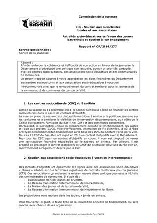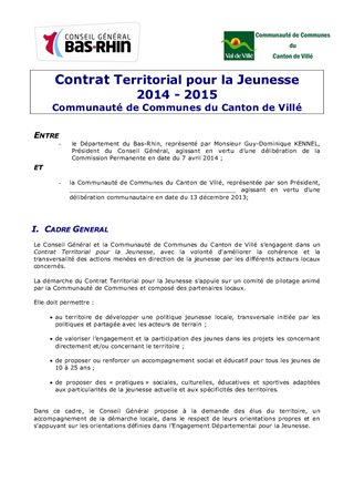 Afin de renforcer la cohérence et l'efficacité de son action en faveur de la jeunesse, le Département a développé une politique contractuelle, autour de priorités partagées, avec les centres socio-culturels, des associations socio-éducatives et des communautés de communes. Le présent rapport soumet à votre approbation les aides financières du Département aux centres socioculturels et aux associations socio-éducatives à vocation intercommunale ainsi que le renouvellement du contrat territorial pour la jeunesse de la communauté de communes du canton de Villé.