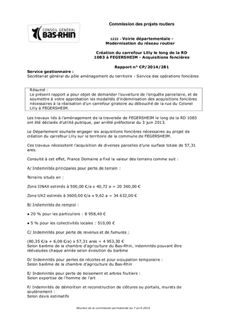 Le présent rapport a pour objet de demander l'ouverture de l'enquête parcellaire, et de soumettre à votre approbation les modalités d'indemnisation des acquisitions foncières nécessaires à la réalisation d'un carrefour giratoire au débouché de la rue du Colonel Lilly à FEGERSHEIM.