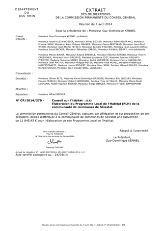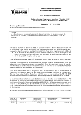 Le présent rapport concerne la demande d'aide financière de la communauté de communes de Sélestat pour l'élaboration de son nouveau Programme Local de l'Habitat.
