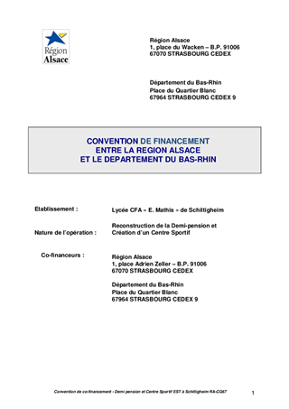 Le présent rapport a pour objet de soumettre à votre approbation la convention de co-financement entre le Département du Bas-Rhin et la Région Alsace pour l’opération relative à la construction neuve d’une demi-pension dans l’enceinte du lycée CFA Emile. Mathis, situé rue du Marais à Schiltigheim (67300).