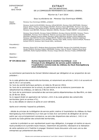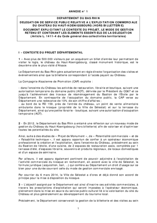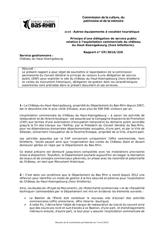 Le présent rapport a pour objet de soumettre à l’approbation de la commission permanente du Conseil Général le principe du recours à une délégation de service public (DSP) pour exploiter le site du château du Haut-Koenigsbourg (hors billetterie et visites du monument historique), délégation de gestion dont les caractéristiques essentielles sont précisées dans le présent document et ses annexes.