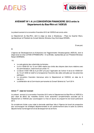 Avenant n°1 à la convention financière de 2013 entre le Département du Bas-Rhin et l’ADEUS