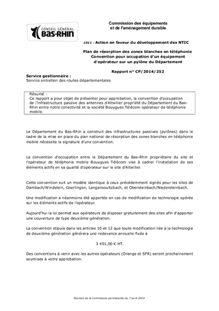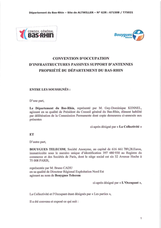 Ce rapport a pour objet de présenter pour approbation, la convention d’occupation de l’infrastructure passive des antennes d’Altwiller propriété du Département du Bas-Rhin entre notre collectivité et la société Bouygues Télécom opérateur de téléphonie mobile.