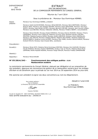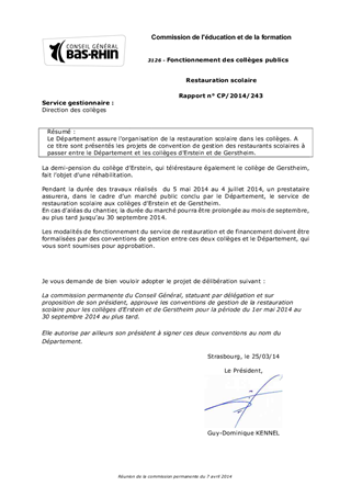 Le Département assure l'organisation de la restauration scolaire dans les collèges. A ce titre sont présentés les projets de convention de gestion des restaurants scolaires à passer entre le Département et les collèges d'Erstein et de Gerstheim.